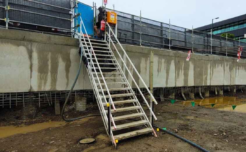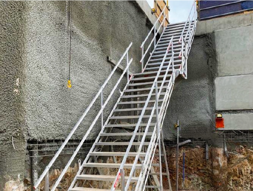 On larger construction projects, scaffolding and scaffold stretcher stair towers are the typical go-to when ingress & egress is required to and from the basement excavation.