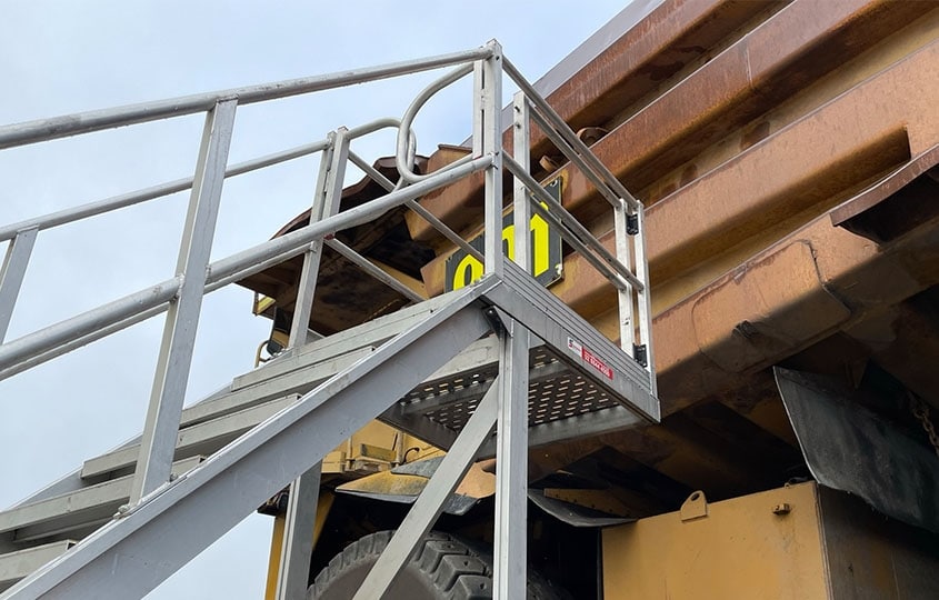 The Hydraulic Box Access Stairs have been designed to allow safe and easy access over the hydraulic box of a CAT 785, 789, 793 into the chassis. The stairs also accommodate access to the front of Haul Trucks, particularly to the radiator and access ladder area.
