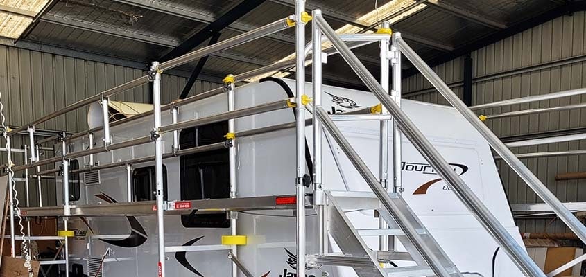 Working together with Jayco, one of our Technical Industry Experts was able to provide the Mini Mobile Scaffolding system as a versatile maintenance solution. Lightweight, redeploy-able, and rigid without compromising height safety for their staff around vehicles and workshops.