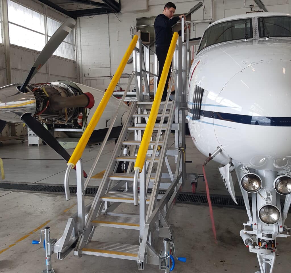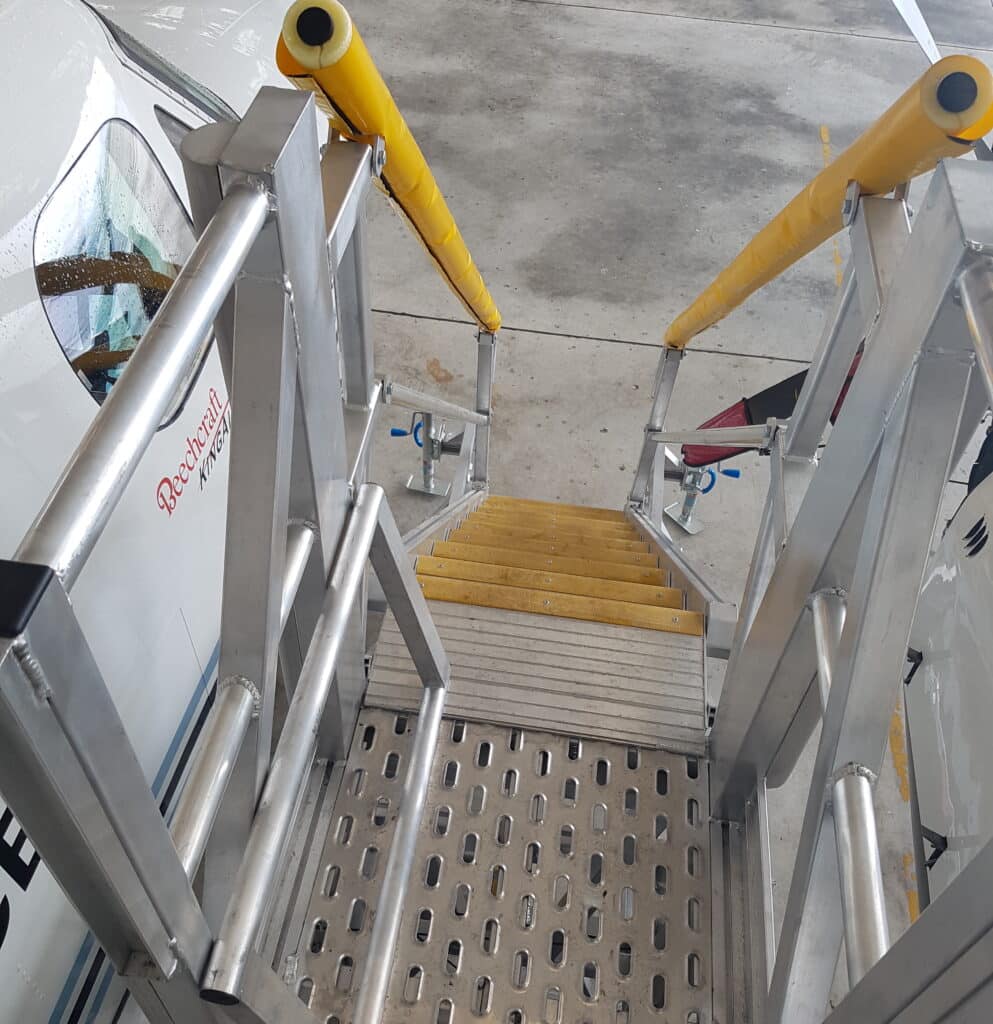 The removable guardrails give the platforms more adaptability for accessing all parts of the aircraft and foam buffers provide protection from metal grazing or dents to the KingAir B250 aircraft. The aluminium construction and lockable casters make the two platforms lightweight and portable. A big tick next to nimbleness and efficiency gained while using the platforms for time-critical maintenance processes.