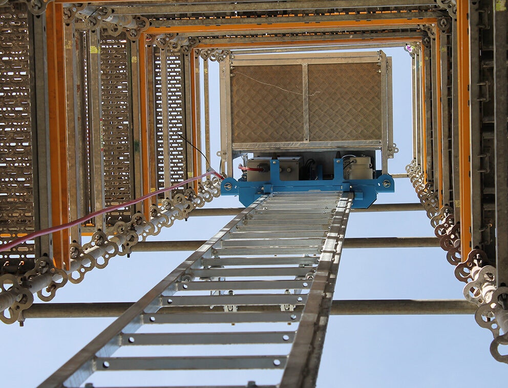 The MC range of hoists climb the mast by means of the rack and pinion system, thus eliminating all the problems derived from cable lifts. The latest safety technology is used by incorporating an overspeed parachute with auto-recovery system.