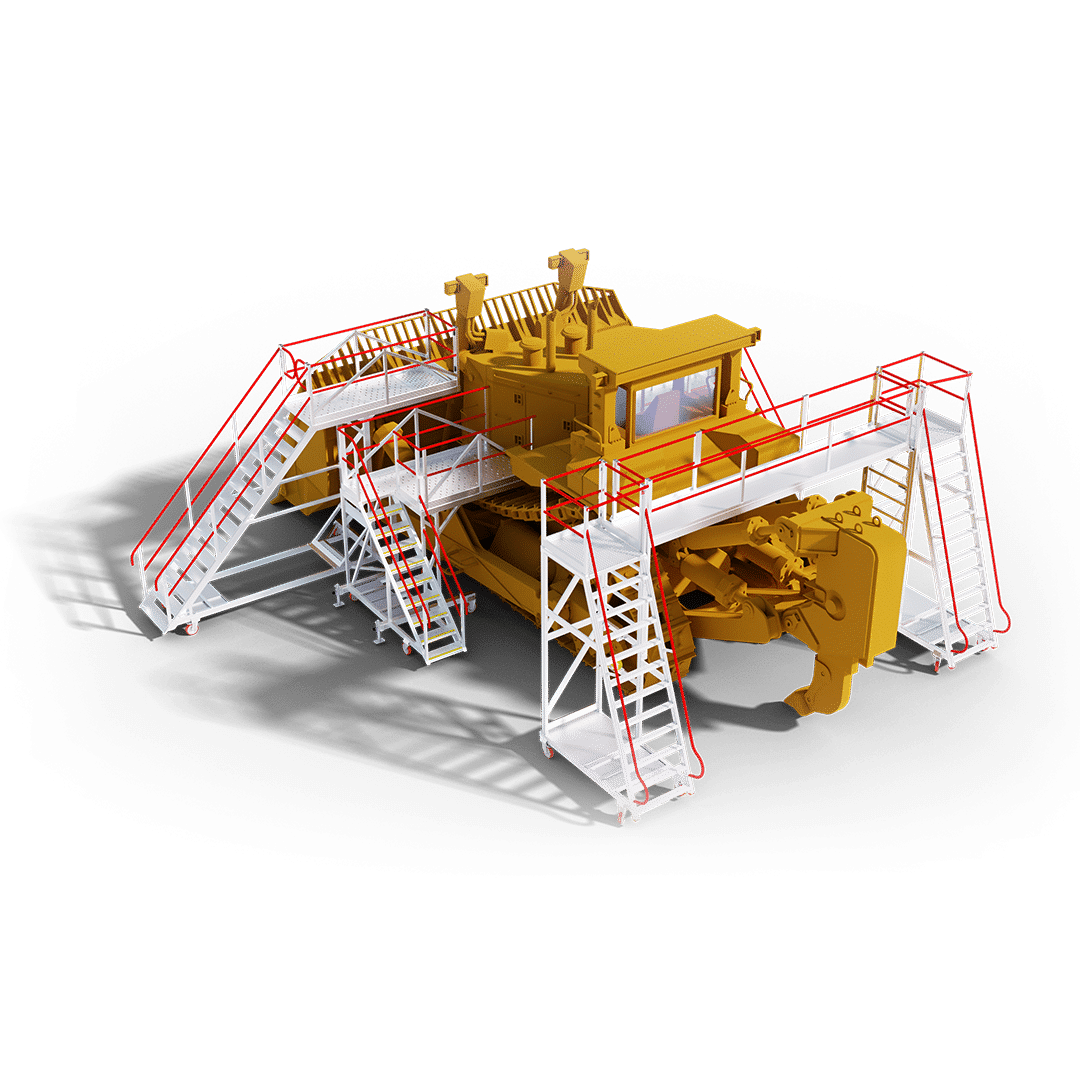 This platform was designed with the restricted space in mining workshops, in mind. With a side cantilever that allows access over the push arm to the dozer track, this design provides perfect access and egress to the engine bay. Supplied in a LH and RH combination also allows for complete access during breakdowns, strips, rebuilds and general repairs.