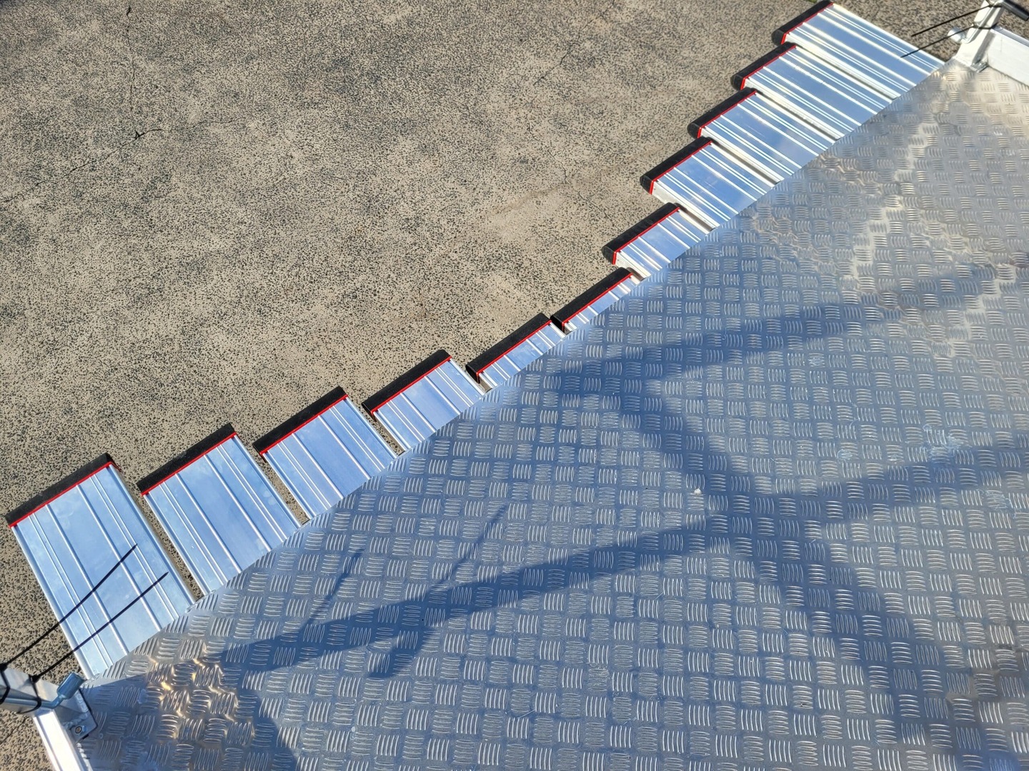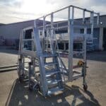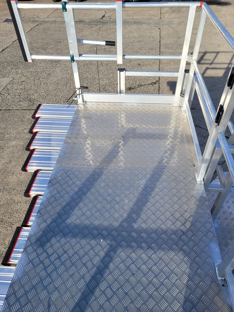 Significantly configurable, this platform will suit varying train profiles with the slider arrangement along the leading edge of the platform. In addition to suiting varying profiles, the platform is adjustable in height to allow work to be completed across the height of the front of the train. With ladder access that telescopes, allowing access from either the rail pit floor or accessible from the rail level, depending on the location of the train. The sliders utilise a ‘shark tooth’ mechanism that ratchets out and automatically locks where it is left. Each slider can be positioned different from the other. To release the sliders, a single handle is positioned on the handrail of the platform that when lifted allows all the sliders to be slid back to a stowed position simultaneously.