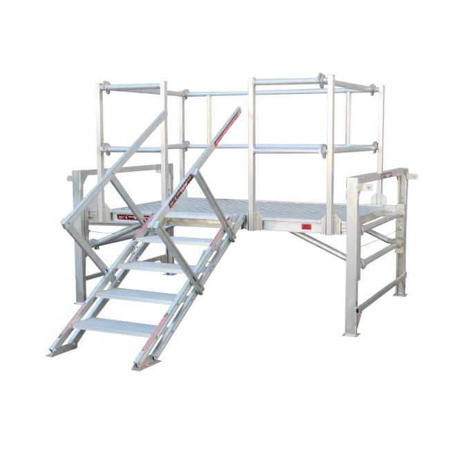 We design in-house, directly with the client, and build many solutions from high-grade aluminium – compliant with regulatory standards such as AS 1657:2018. This oil rig platform features height adjustability (0.3-1m), self-levelling stairs for accommodating different height ranges and towing lugs for easy transporting around the rig. This platform also has a 225kg weight rating.