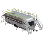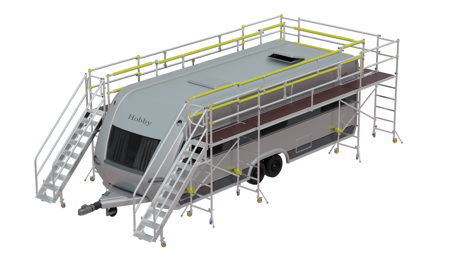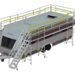Utilising the proven components of our aluminium mobile scaffold system, including custom stairs, longboard packs, and corner packs, the U-Shaped Vehicle Access Platform seamlessly creates two side platforms and a rear joining platform. This configuration provides optimal accessibility and manoeuvrability, allowing workers to efficiently carry out caravan builds with ease.